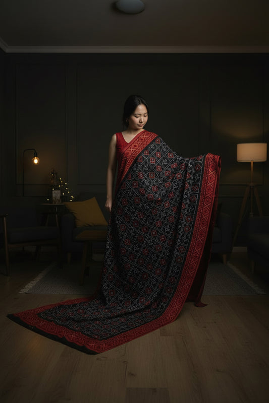 Pure Modal Silk Saree - Handblock Ajrakh on red and black saree with hand work