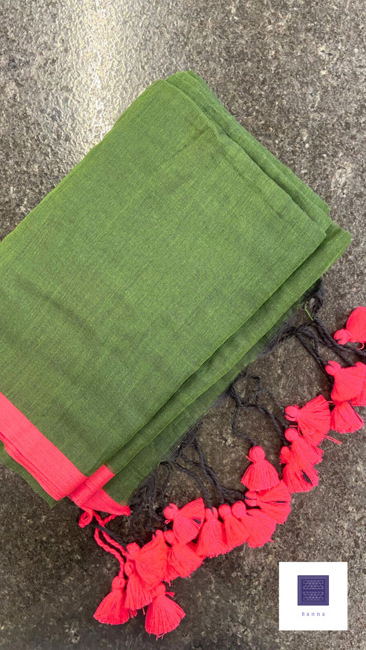 Soft Mul Cotton saree - Dark Green with Reddish Pink border