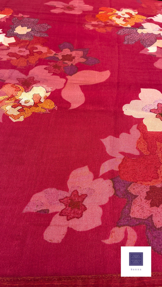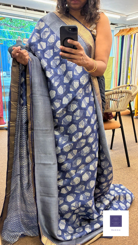 Pure Kora Silk with luxurious floral prints - White and Blue