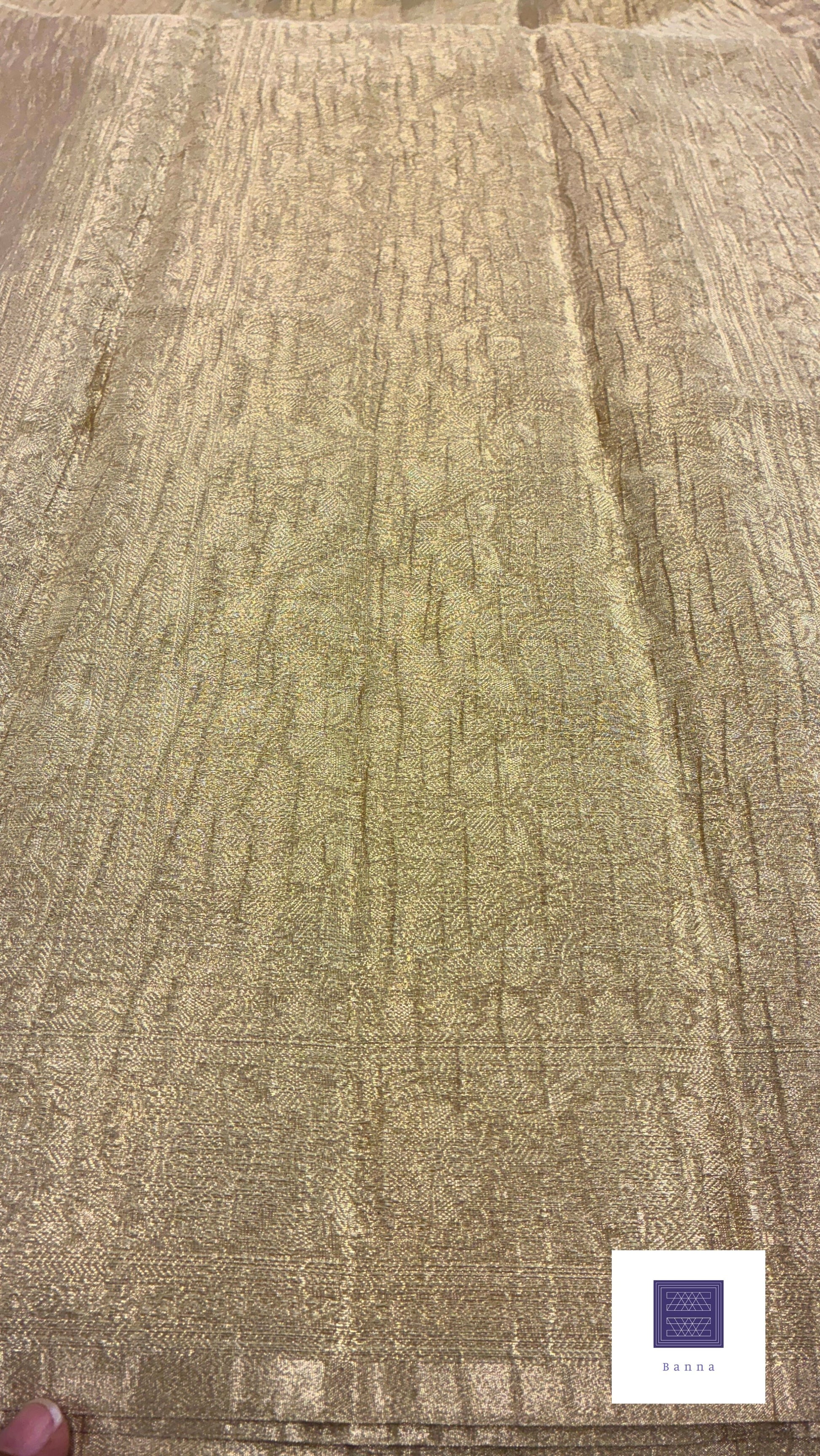 Elevate your festive look with our Shimmering Evening wear or festive wear with borders in Banaras weaving. The shimmering crush tissue fabric creates a stunning visual effect, perfect for any special occasion. Complete the look with your favorite jewelry for an even more glamorous ensemble. Its a unique drape looks like lehenga saree....