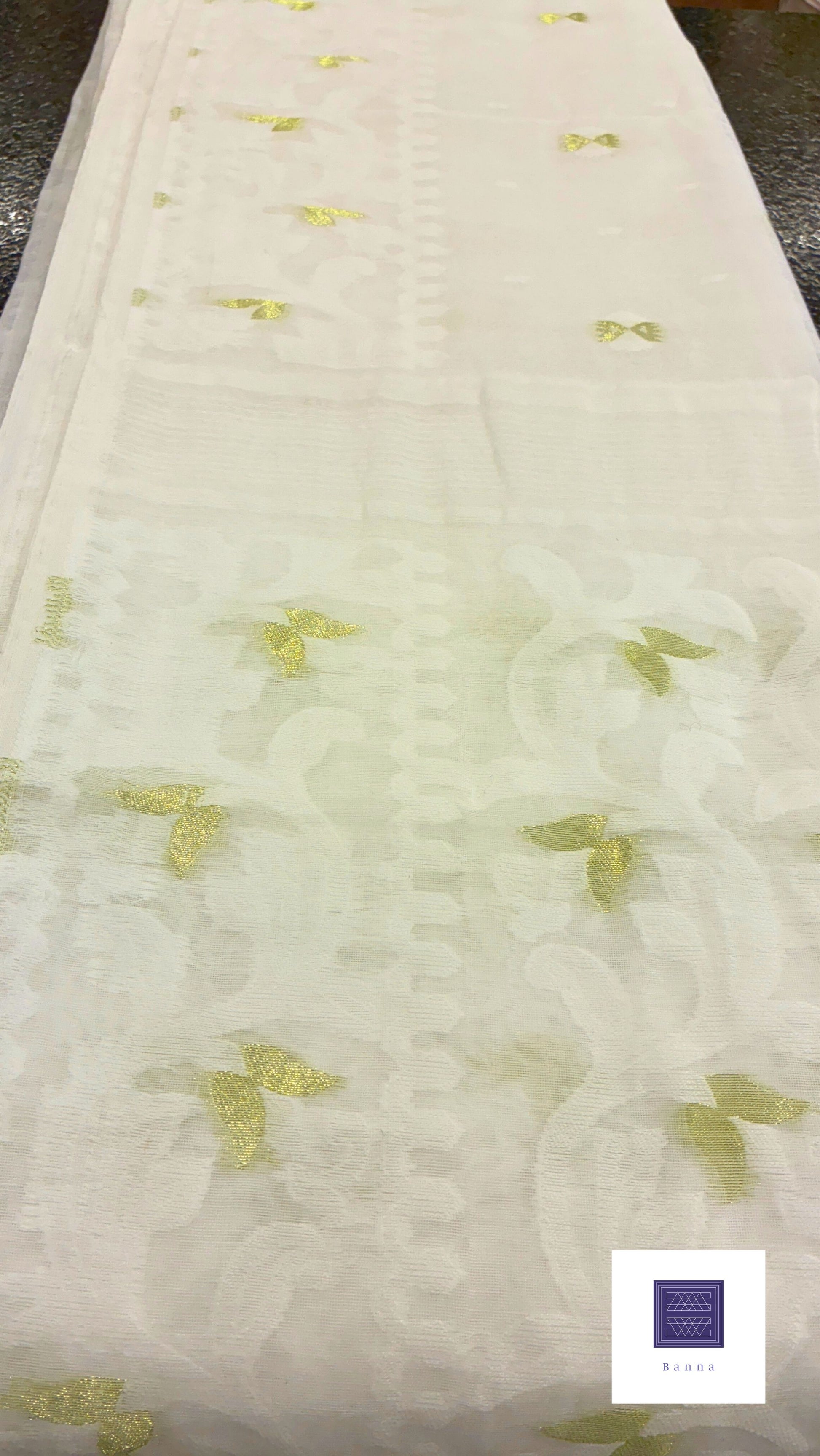 Crafted from soft cotton, this white saree showcases intricate Jamdhani weaving, a traditional technique known for its delicate and detailed patterns. The lightweight fabric ensures comfort while the exquisite craftsmanship adds an elegant, timeless appeal, making it ideal for both formal occasions and everyday sophistication.
