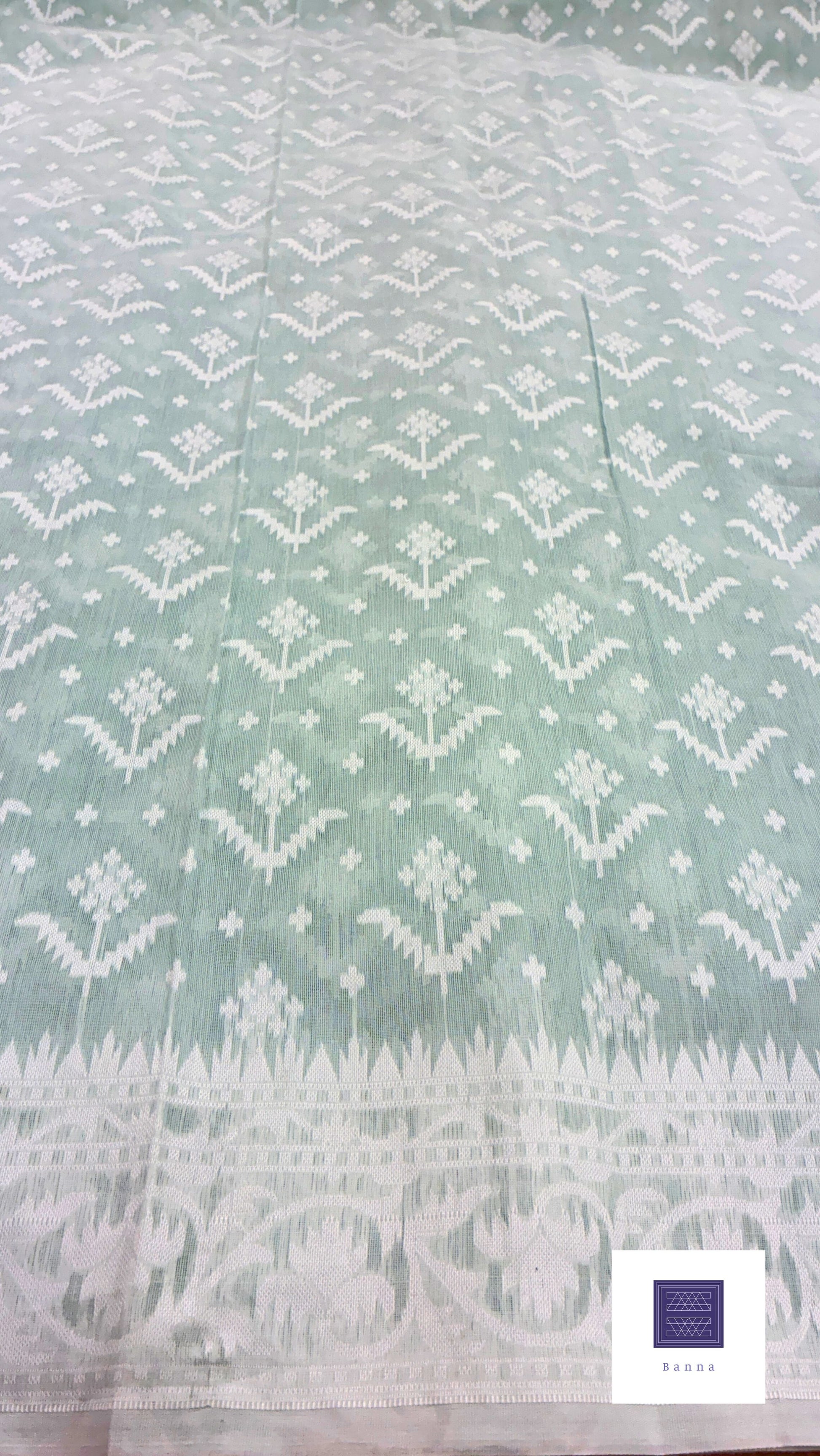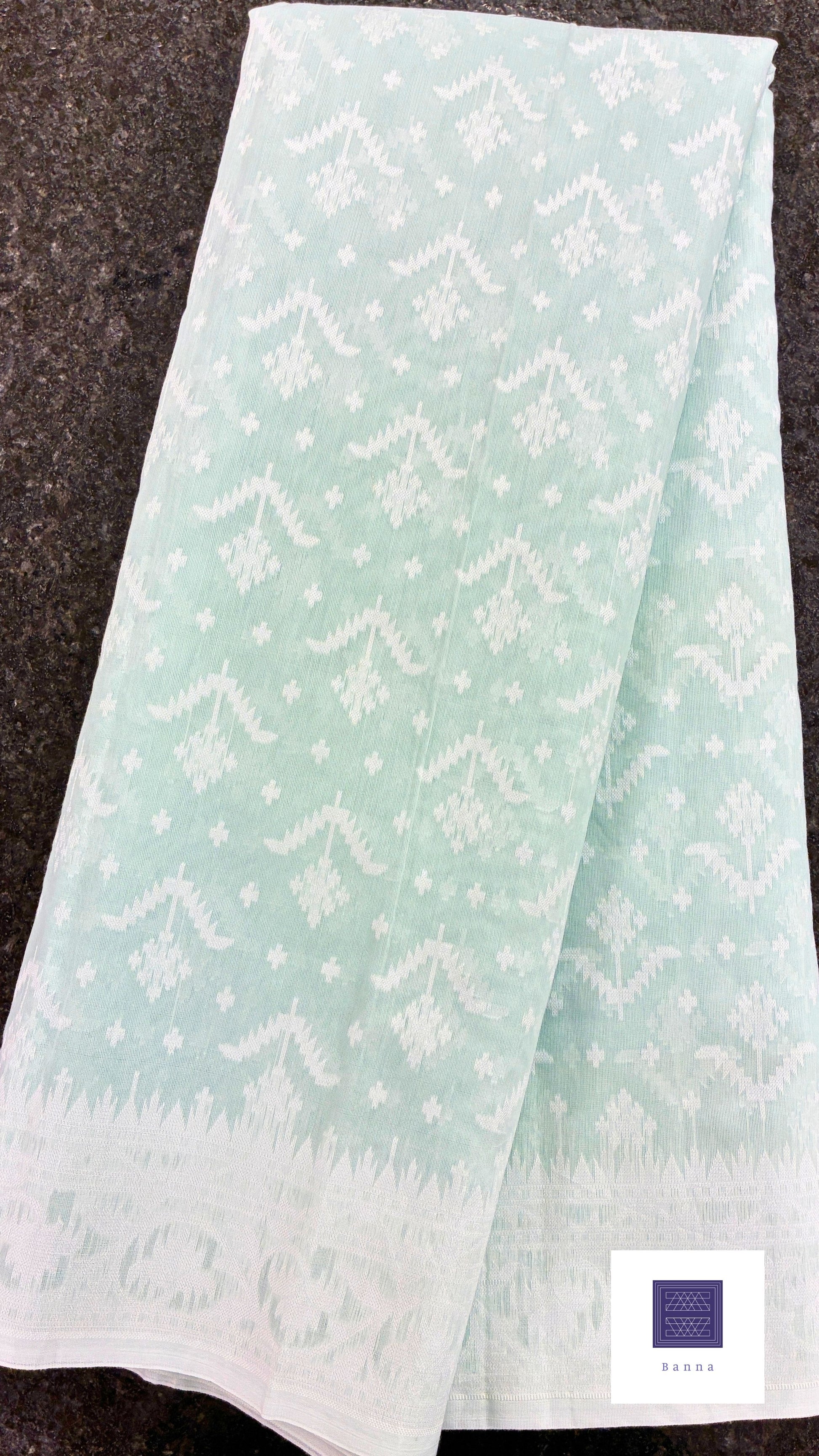 Crafted from soft cotton, this sky blue saree showcases intricate Jamdhani weaving, a traditional technique known for its delicate and detailed patterns. The lightweight fabric ensures comfort while the exquisite craftsmanship adds an elegant, timeless appeal, making it ideal for both formal occasions and everyday sophistication.