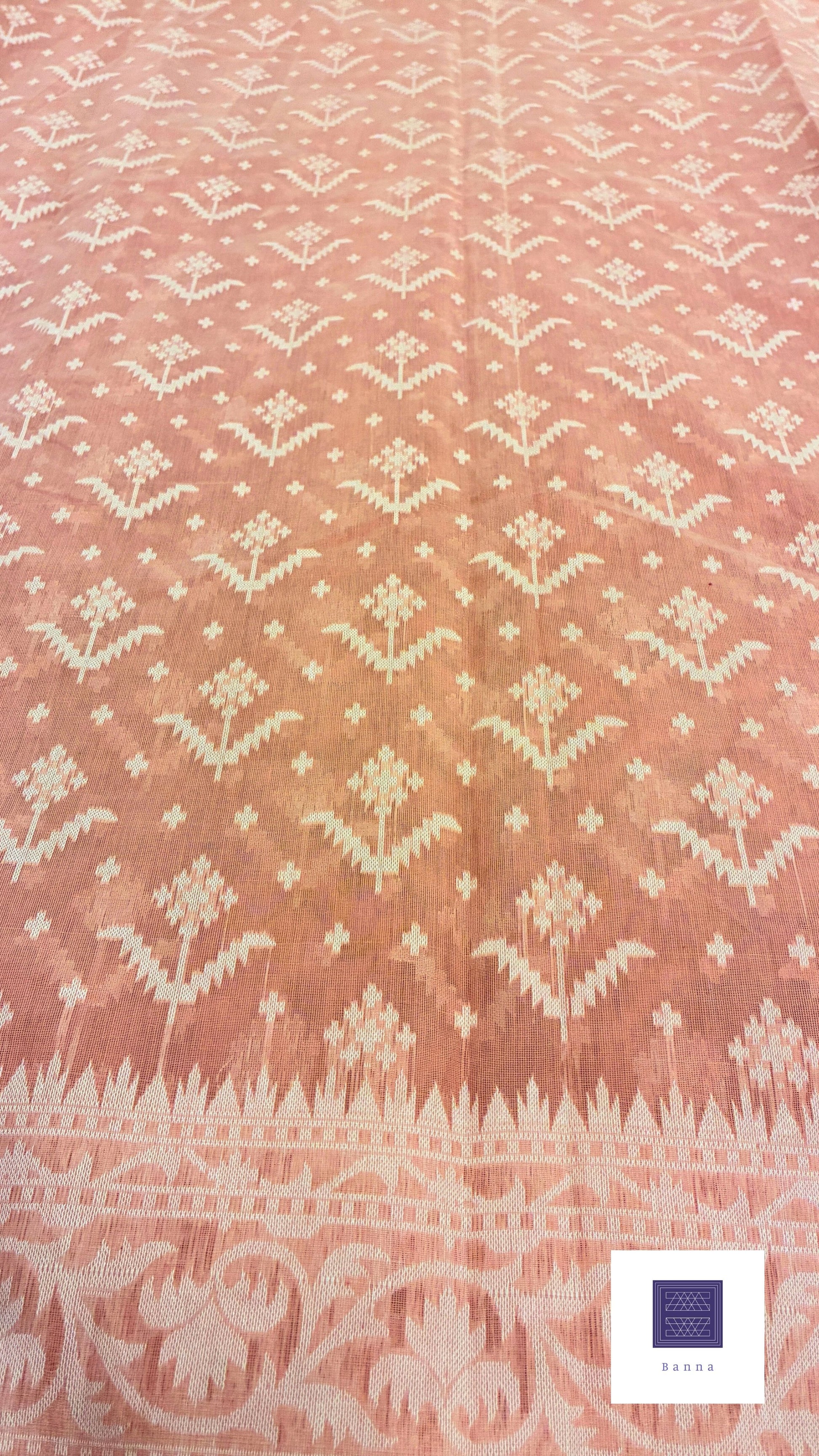 Crafted from soft cotton, this baby pink saree showcases intricate Jamdhani weaving, a traditional technique known for its delicate and detailed patterns. The lightweight fabric ensures comfort while the exquisite craftsmanship adds an elegant, timeless appeal, making it ideal for both formal occasions and everyday sophistication.