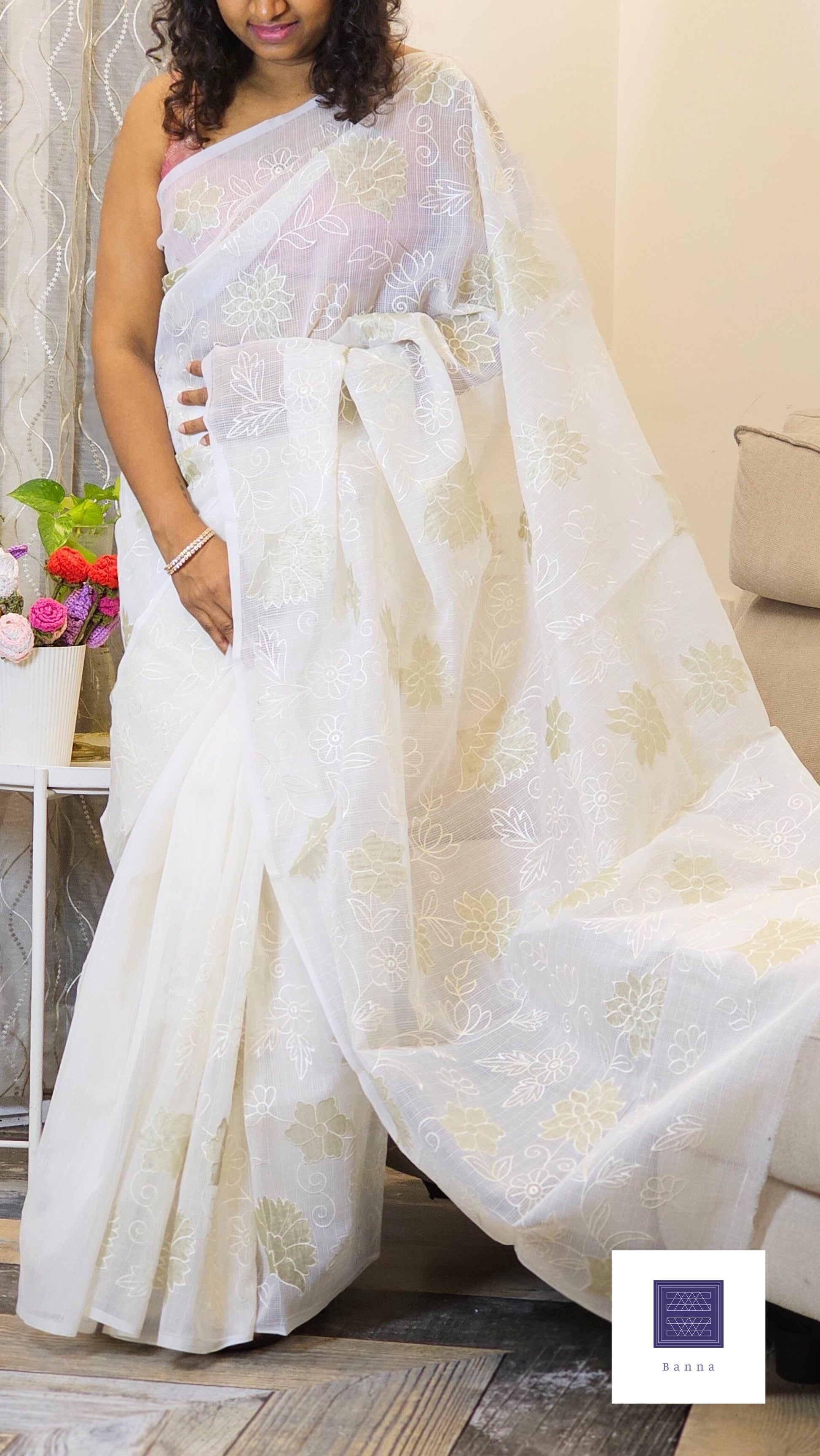 Kota cotton saree with floral embroidery and appliqué - Off White
