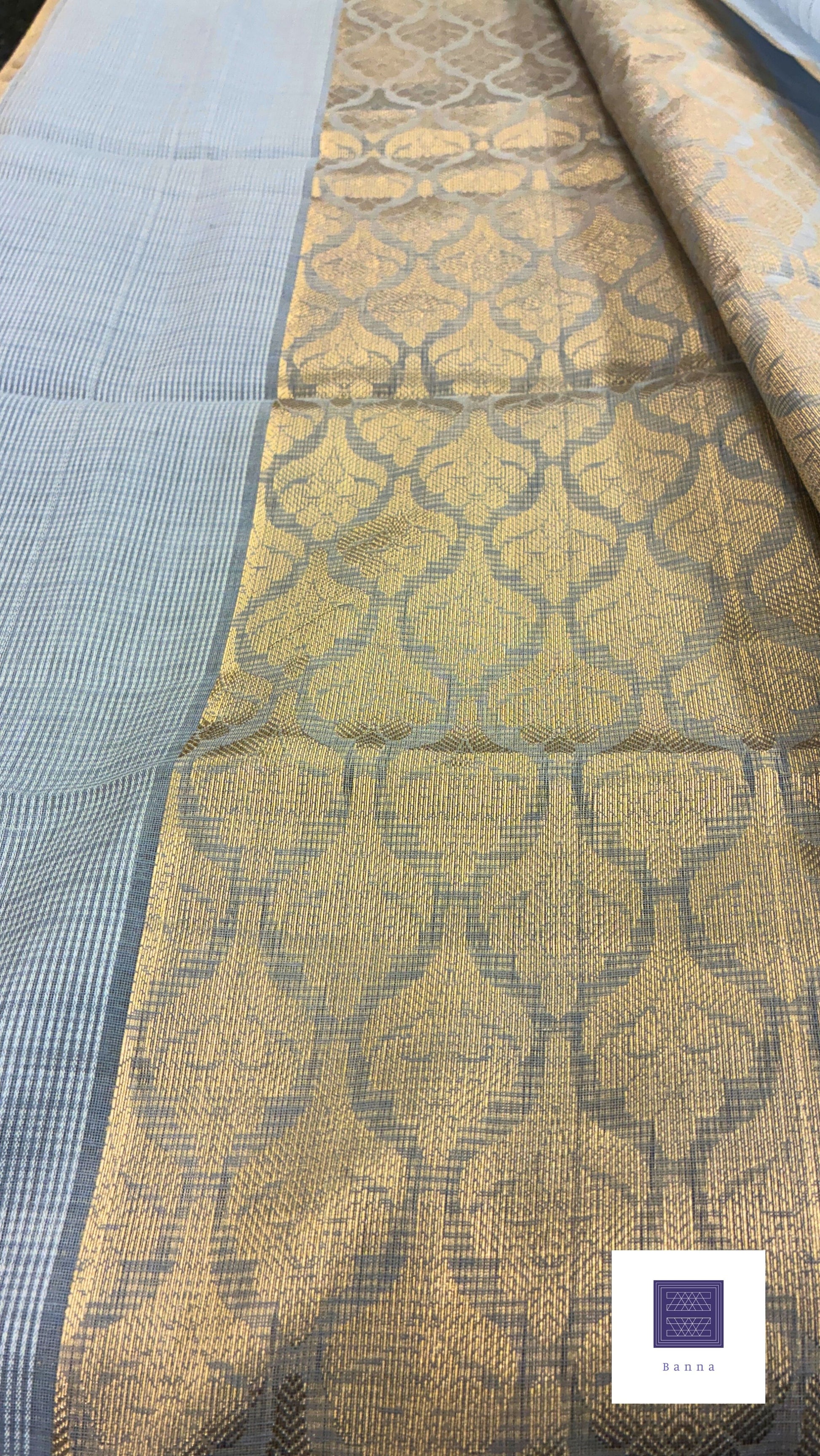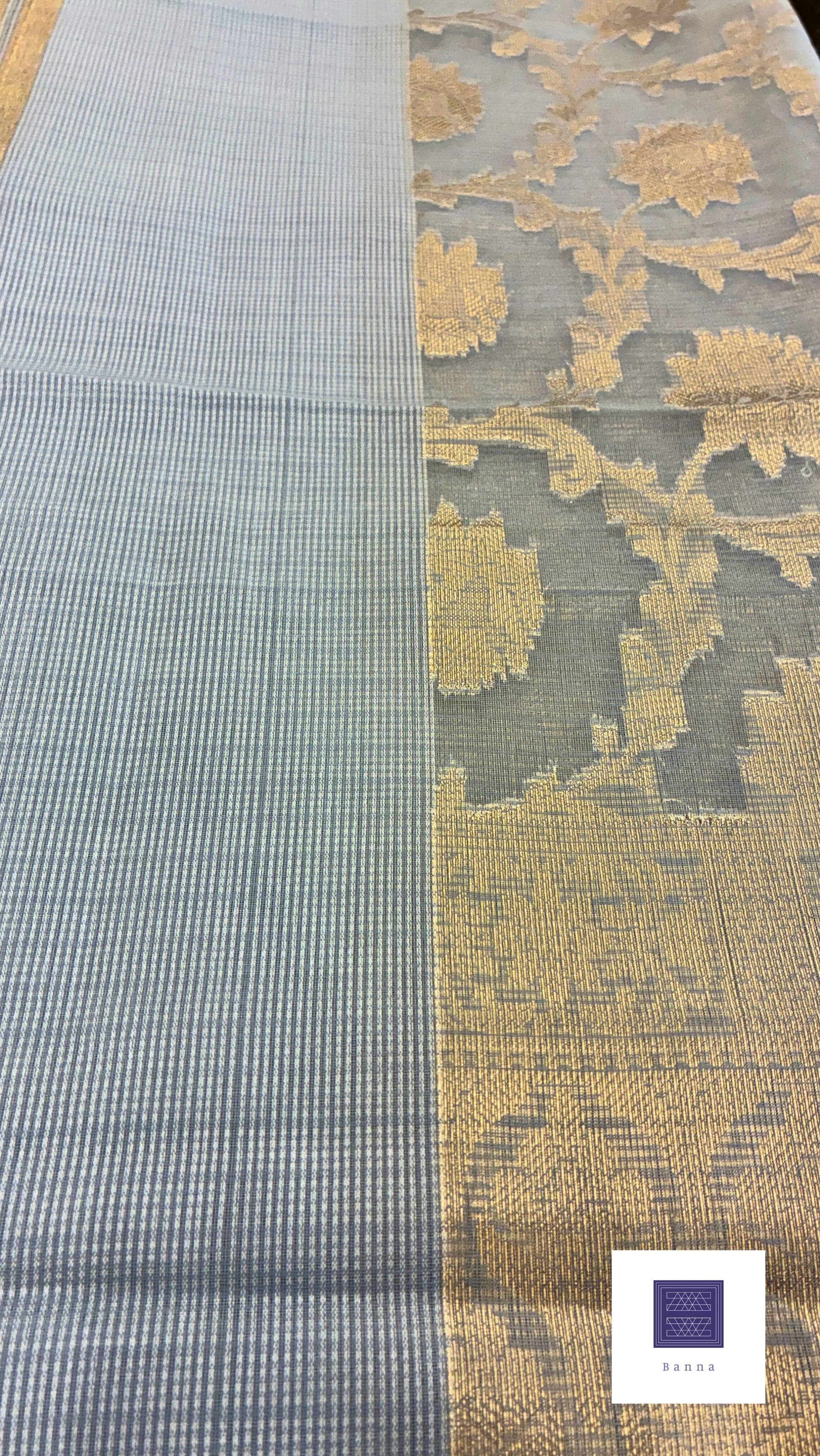 Experience the timeless elegance of this Light Grey Kota Cotton saree, enhanced with intricate Banarasi floral weaving. Crafted for comfort and sophistication, the breathable Kota cotton fabric is complemented by the rich texture of a matching blouse, making it ideal for both festive occasions and formal gatherings. This saree beautifully combines traditional craftsmanship with modern wearability, ensuring you stand out with subtle grace.