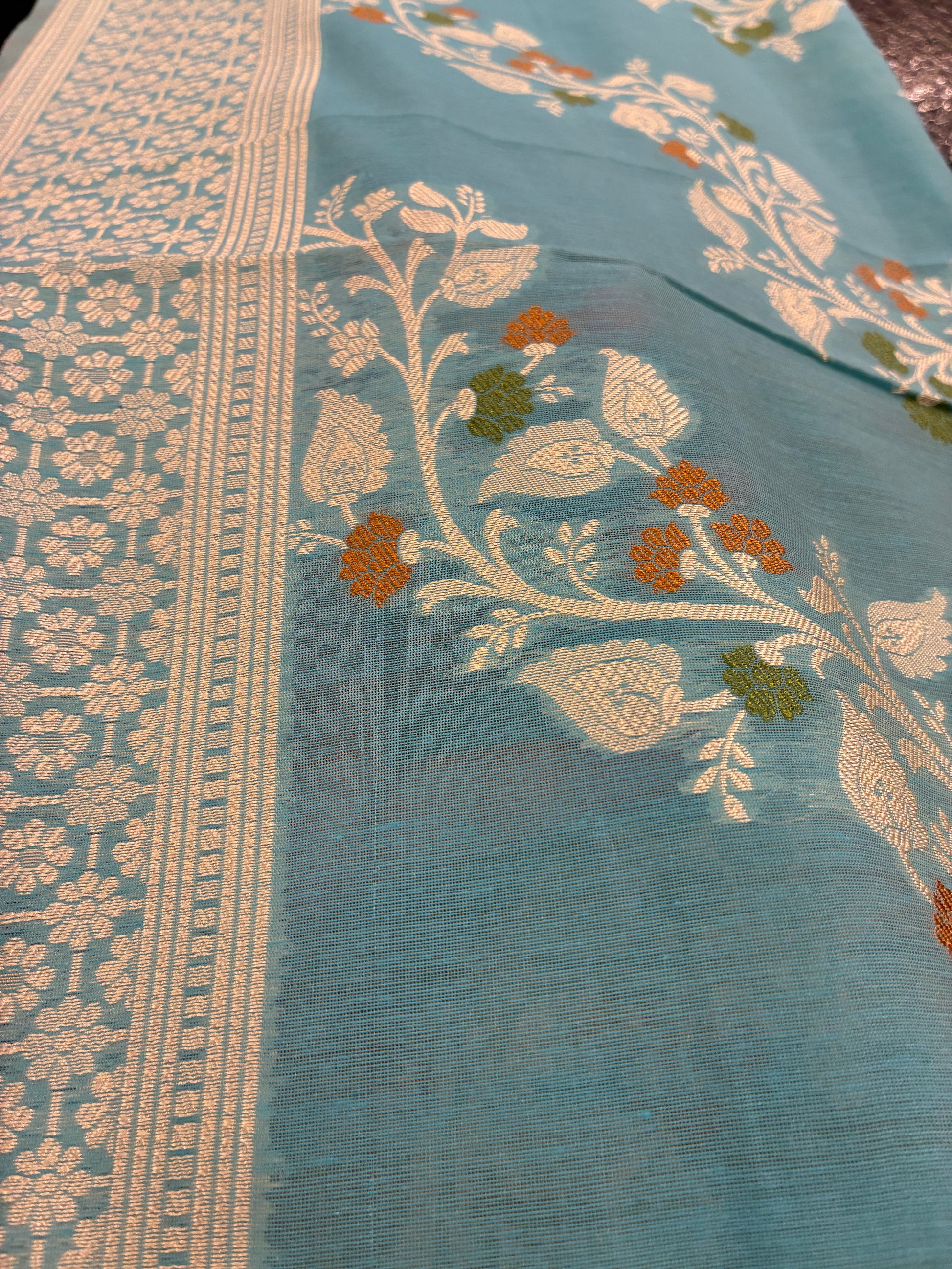 Discover the exquisite love of Banaras woven into this cotton saree. Adorned with antique gold zari work, this rich and festive saree is a timeless addition to any wardrobe. Elevate your style with the intricate craftsmanship of Banarasi weaving in light blue color
