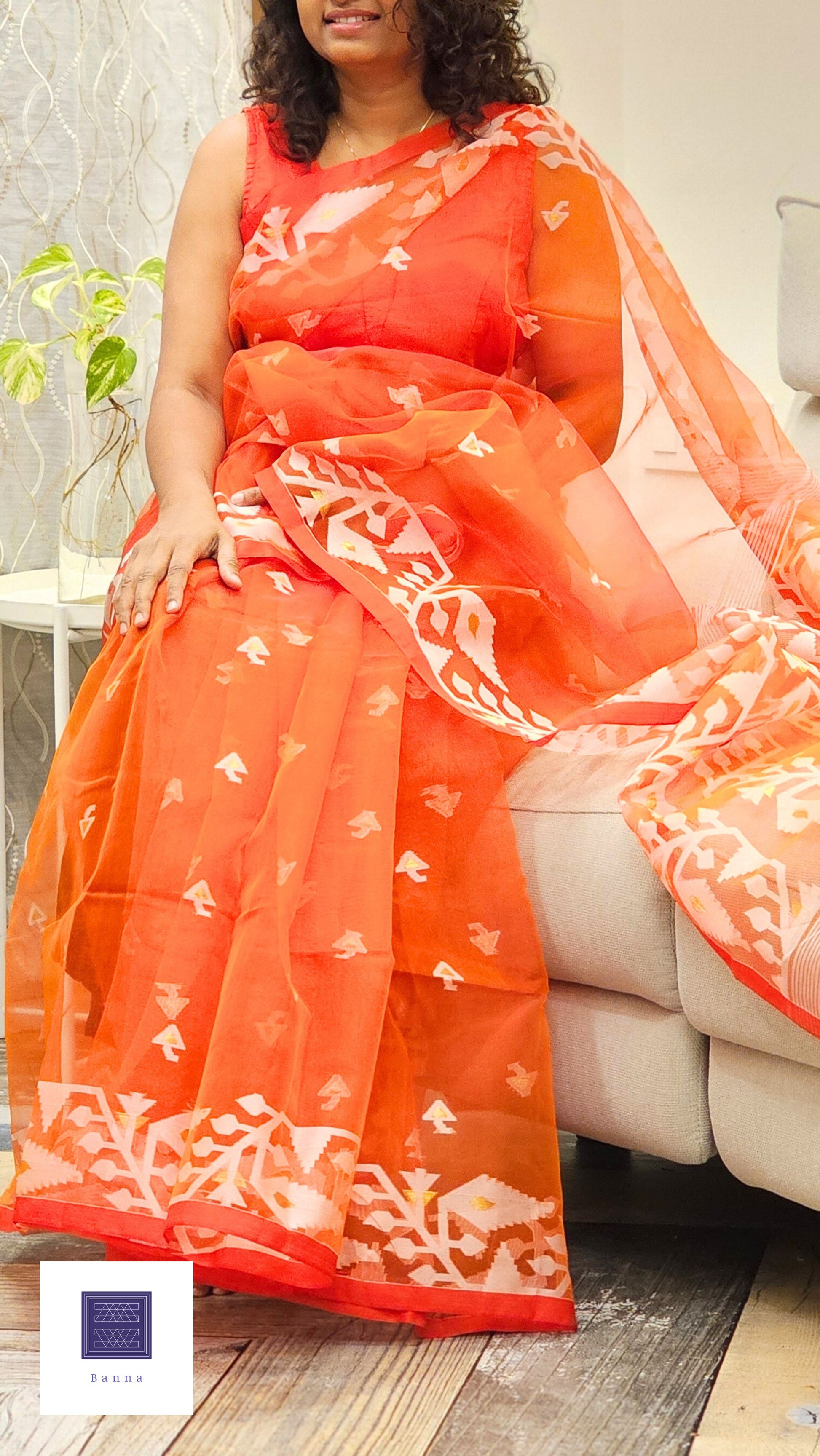 Discover pure luxury with our Pure Muslin Jamdhani Silk Saree in Orange. Crafted from the finest muslin silk and adorned with jamdhani designs, this saree exudes elegance and sophistication. Stand out from the crowd and elevate your style with this exclusive and timeless piece.