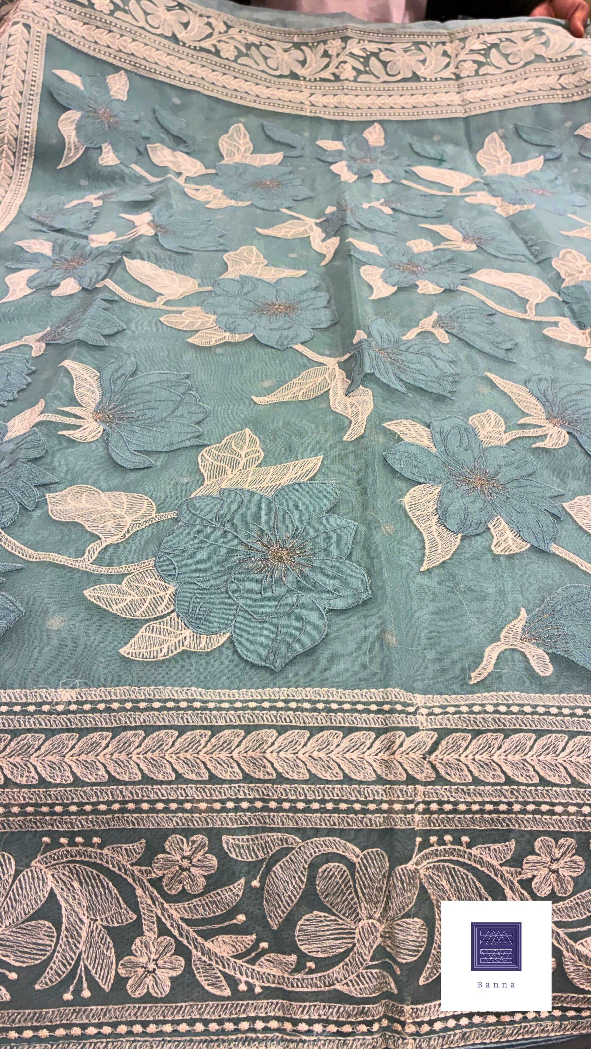 Rich Organza Appliqué and thread work saree - Greenish Blue