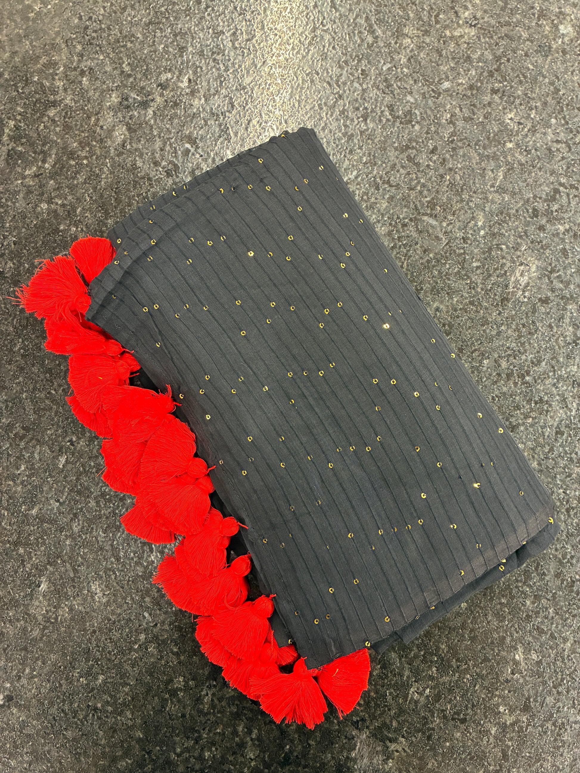 This black breathable mul Cotton saree is the perfect choice for a workday. Made from high-quality cotton, it offers both comfort and elegance. This saree is a must-have for any wardrobe, providing a simple and timeless look. Elevate your style with this beautiful saree.